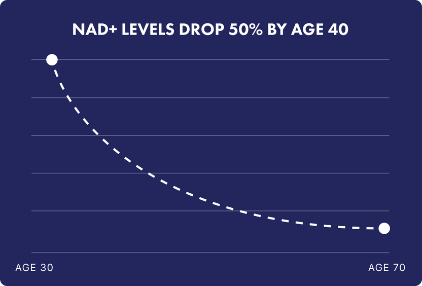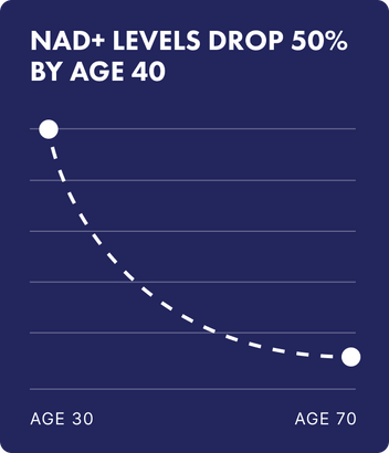 By your 40s, NAD+ levels are just half of what they were in your youth.⁶